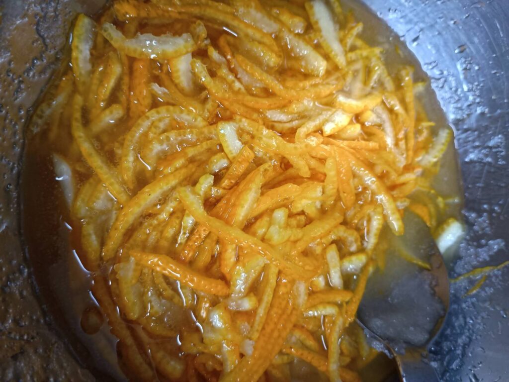 皮を使うので中の薄皮を取り除き、白いわたの部分をスプーンでとる。(少し残った状態でも大丈夫です。)