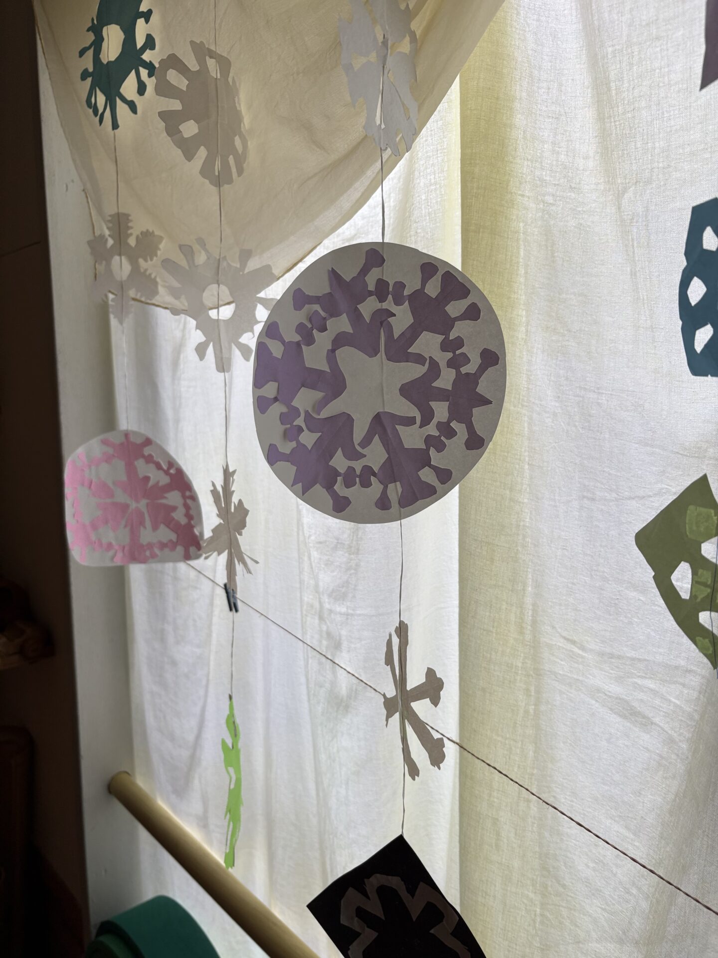 お部屋をゆらゆらと揺れるたくさんの「雪の結晶」たちは、冬の窓辺を暖かく飾ってくれています。