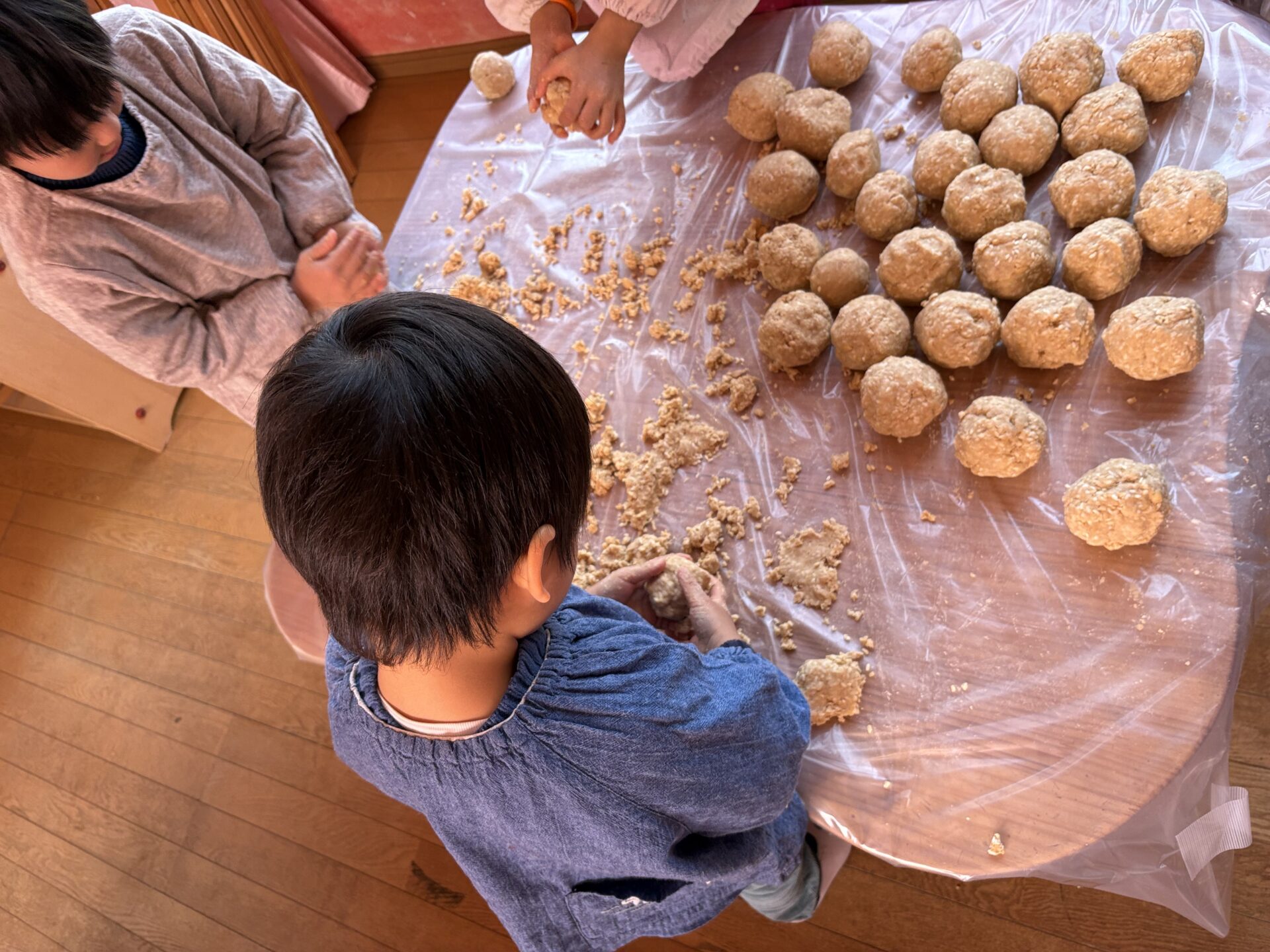 年長のお姉さんが、年少の男の子を優しく手伝いながらコロコロとお団子を丸めます。