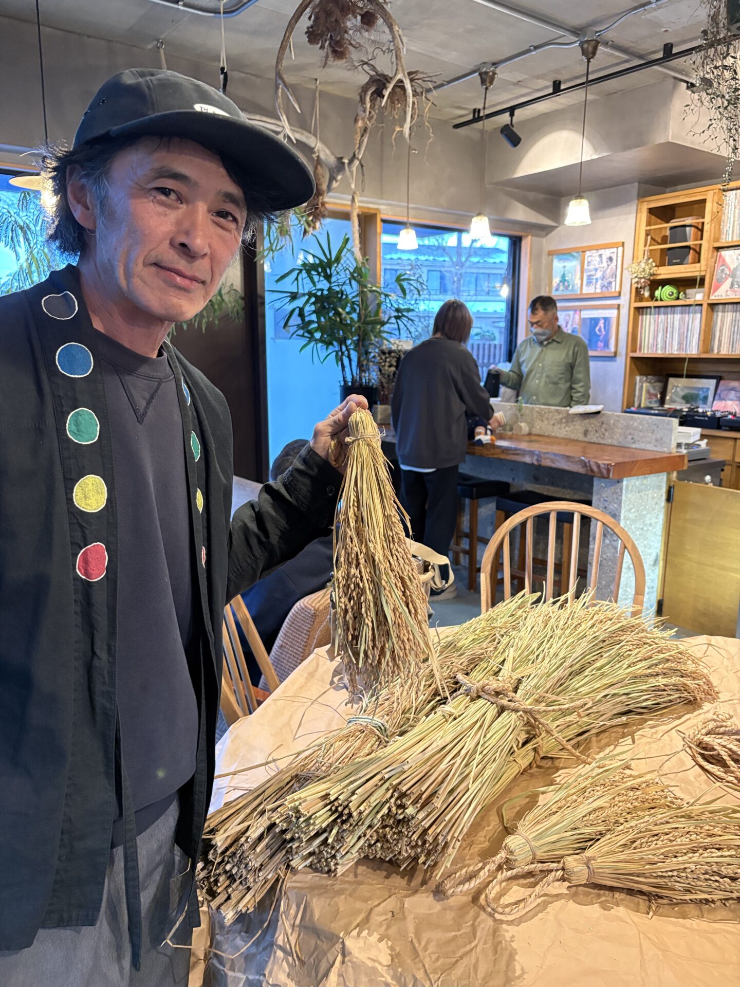 近所のカフェのワークショップに参加したのです。刈り取った稲の穂をタッセルを作る要領でまとめた、シンプルで素敵なお飾りです。
